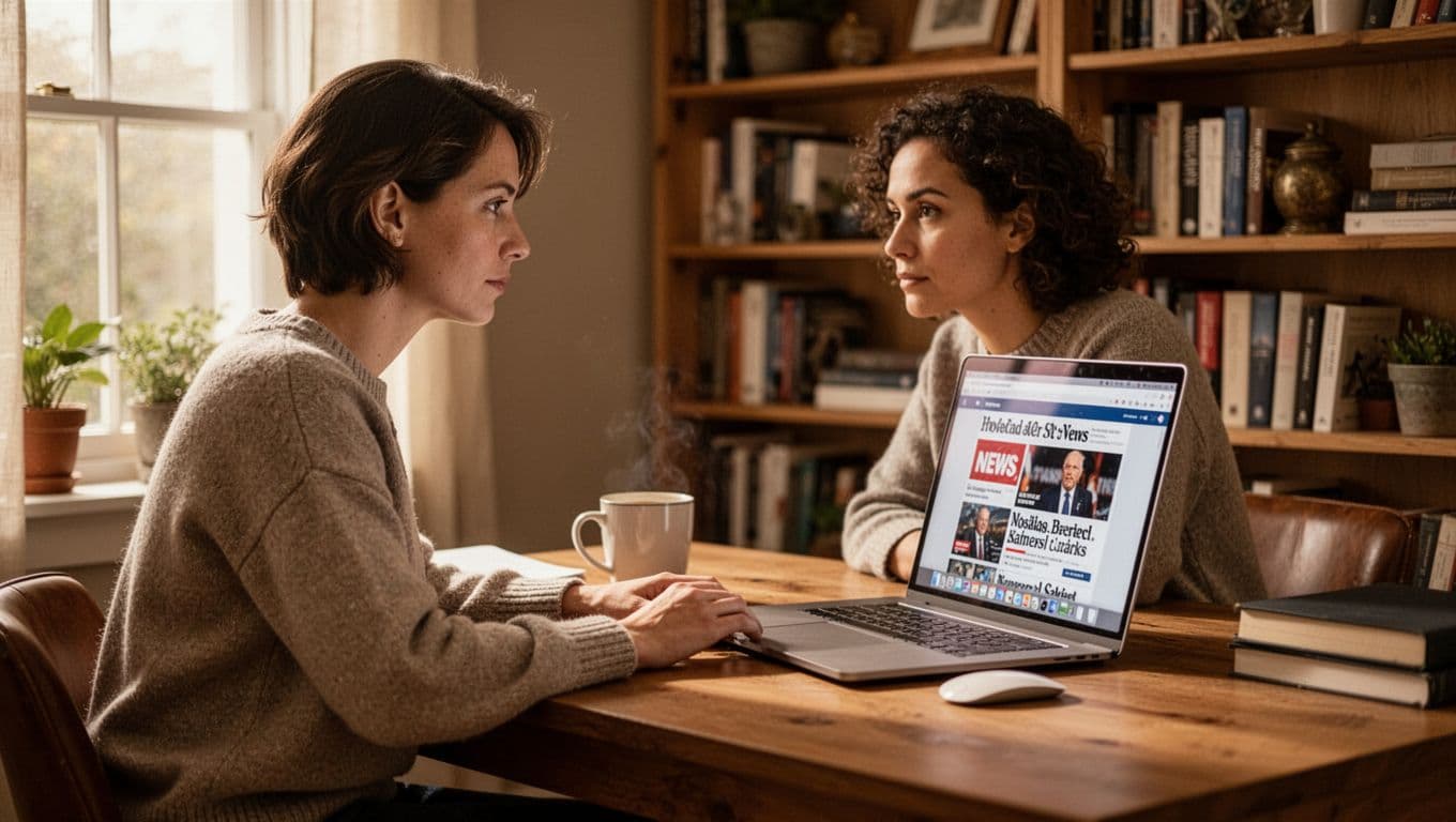 Someone double-checking headlines before sharing, created with AI.